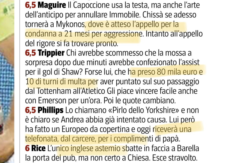 Caso mai vi fossero sfuggite le pagelle del Corriere della Sera ai giocatori della Nazionale inglese. Testuali. “Maguire: chissà se adesso tornerà a Mykonos, dove è atteso l’appello per la condanna a 21 mesi per aggressione”. “Trippler: chi avrebbe scommesso che avrebbe confezionato l’assist per il goal di Shaw? Solo lui, che ha preso 80 mila euro e 10 turni di multa per aver puntato sul suo passaggio dal Tottenham all’Atletico”. “Phillips: lo chiamano il ‘Pirlo dello Yorkshire’ e non è chiaro se Andrea gli abbia già intentato causa. Comunque riceverà oggi una telefonata di complimenti dal carcere, dove si trova papà”.