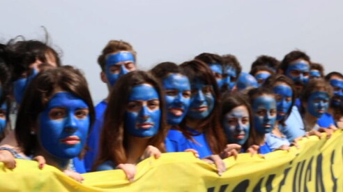 Un'onda blu attraversa il mondo: è Giornata mondiale degli Oceani Attivisti di Greenpeace con il volto dipinto di blu 08 GIU 2019