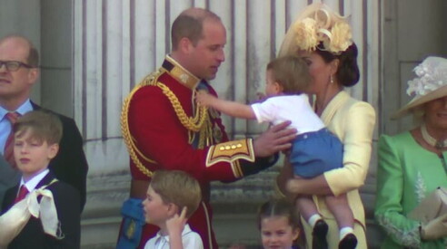 La famiglia reale al completo sul balcone di Buckingham Palace Louis insiste per andare in braccio a papà William 08 GIU 2019
