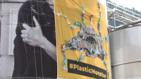 Greenpeace porta il "mostro" alla fabbrica Nestlé-San Pellegrino Attivisti incatenati chiedono lo stop della plastica usa e getta 16 APR 2019