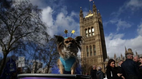 Cani per il "Wooferendum" a Westminster, domani voto sulla Brexit Irlanda annuncia ultimo tentativo May a Strasburgo, lei smentisce 11 MAR 2019