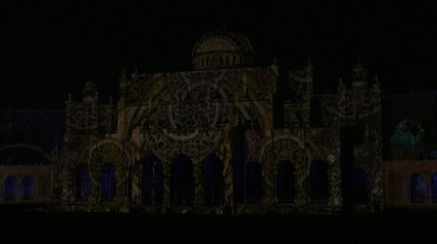 Illuminazione da Mille e Una Notte sui palazzi di Sharja Giochi di luce sui palazzi e la moschea Al-Noor 14 FEB 2019