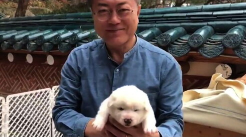 Moon Jae-in tiene in braccio i cani del disgelo tra le due Coree I cuccioli nati da Gomi di razza Pungsan regalata da Kin Jong-un 07 DIC 2018
