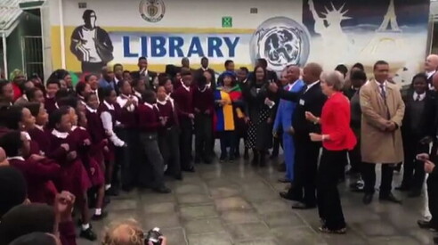 Theresa May balla con un gruppo di studenti a Città del Capo Durante una tappa del suo viaggio in Africa 28 AGO 2018