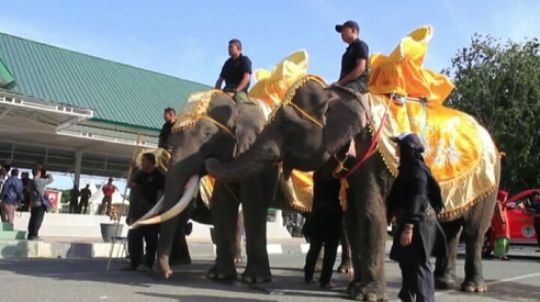 La parata degli elefanti di Sumatra a Banda Aceh Decorati con stoffe locali che ricordano il sultano 07 AGO 2018
