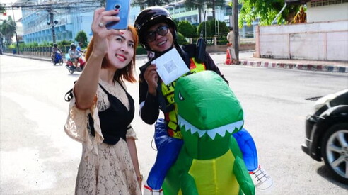 Poliziotto-tirannosauro dirige il traffico vicino Bangkok Appostato davanti a una scuola per far rispettare le regole 04 GIU 2018