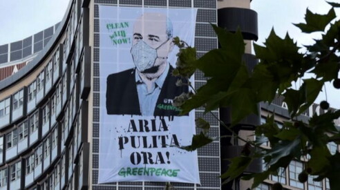 Smog, azione di Greenpeace alla Regione Lazio: "Aria pulita ora!" Srotolato striscione con Zingaretti con una maschera antismog 30 MAG 2018