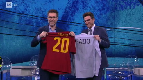 Divertente scambio di "maglie" tra Fazio ed Eusebio di Francesco A Fabio quella del giocatore nr 20 e un "In bocca alla lupa" 30 APR 2018