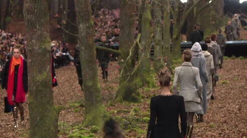 Moda Parigi, bellissime modelle di Chanel sfilano in una foresta Show faraonico con sfumature della natura nelle stagioni fredde 06 MAR 2018