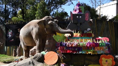 Torta di frutta e verdura per i 57 anni dell'elefantessa Trompita Grande festa allo Zoo Aurora di Città del Guatemala 19 FEB 2018