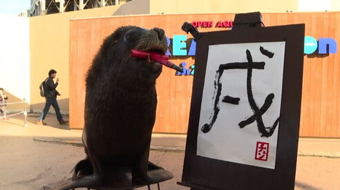 Mr Chen, il leone di mare che disegna il segno del cane Si sta allenando con speciale pennello per il nuovo anno cinese 27 DIC 2017