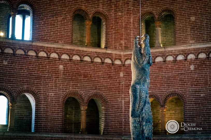 Il coccodrillo imbalsamato esposto da Cattelan nel battistero di Cremona (foto Diocesi di Cremona/Facebook)