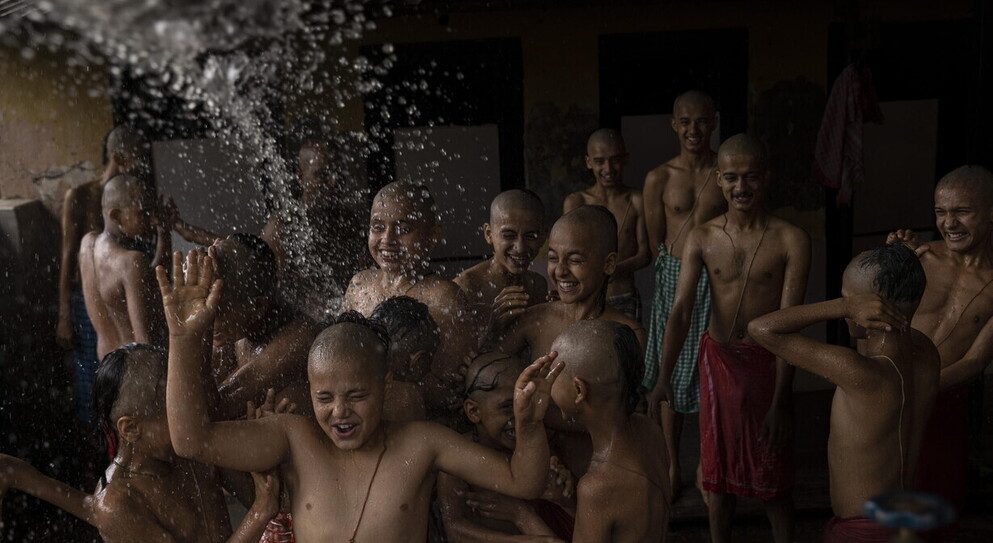 Dio benedica il bambino distratto. Una magnifica foto di Narendra Shrestha per l’agenzia EPA mostra una trentina di ragazzini, studenti accompagnati dall’insegnante, mentre pregano davanti al tempio di Pashupatinath, a Katmandu, per la festa indù di Junai Purnima. Rapati a zero e a torso nudo, sotto lo sguardo vigile dell’insegnante, i ragazzini nepalesi levano le braccia in posa ieratica, salvo un bambino che le tiene sì sollevate, ma si volta e mostra all’obiettivo il ciuffo residuo sulla nuca. Perché si volta quel bambino? Cosa ha visto o sentito che ha richiamato la sua attenzione, distogliendola dalla cerimonia?
