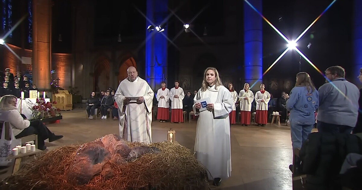 Nella scena della natività, un'attrice rantolava nella mangiatoia coperta da simil-placenta. La diocesi ha ammesso di aver modificato la liturgia proprio perché era trasmessa in tv. Da messa a messa-in-scena