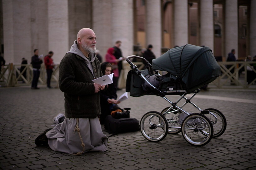 Durante i funerali di Benedetto XVI. Una donna con la veletta nera sul capo, una carrozzina, un frate. Inginocchiati a simboleggiare il mondo riunito in piazza per un Papa defunto. (Matzuzzi)