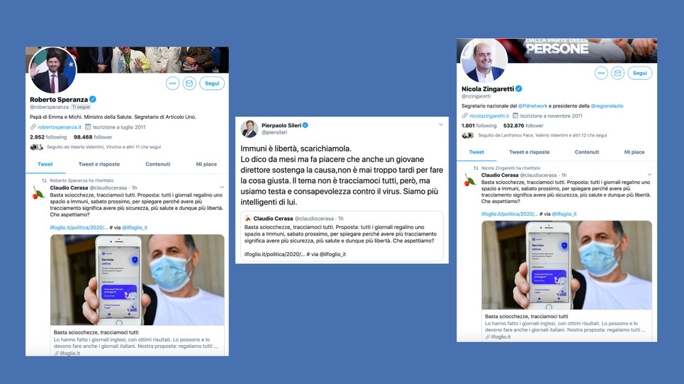 Il segretario del Pd Nicola Zingaretti, il ministro della Salute Roberto Speranza e il viceministro della Salute Pierpaolo Sileri hanno rilanciato l’appello dal direttore Claudio Cerasa, con il quale chiede ai giornali di dedicare una pagina per promovuore il download dell'"app anticontagio" Immuni.