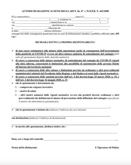 Ecco l'autocertificazione per spostarsi durante il coprifuoco