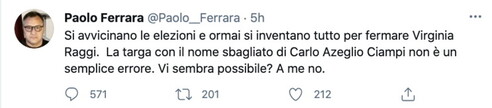 “Sulla delibera il nome è scritto bene”, ripetono dallo staff della prima cittadina accollando la colpa sull’l’UGAIMTTTNC e spingendo persino il consigliere grillino Paolo Ferrara a teorizzare il complotto. “Si avvicinano le elezioni e ormai si inventano tutto per fermare Virginia Raggi. La targa con il nome sbagliato di Carlo Azeglio Ciampi non è un semplice errore. Vi sembra possibile? A me no”.