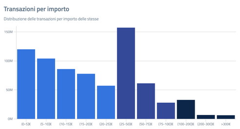 Quanto al tipo di transazioni, consultando i dati dell'app Io, si ricava che la fetta più consistente degli utenti, un'italiano su 5, abbia ricorso al Cashback per acquisti con un importo compreso tra i 25 e i 50 euro, mentre il 16, 3 per cento ha usato i pagamenti digitali spendendo al massimo 5 euro. Un dato in qualche modo significativo, se si considera che fino a qualche mese fa erano tanti gli esercizi, al di fuori della grande distribuzione, a rifiutare pagamenti dall'importo così basso. Le transazioni di questo tipo sono state circa 120 milioni. Al contrario, solo lo 0,84 per cento delle operazioni risulta superiore ai 300 euro.