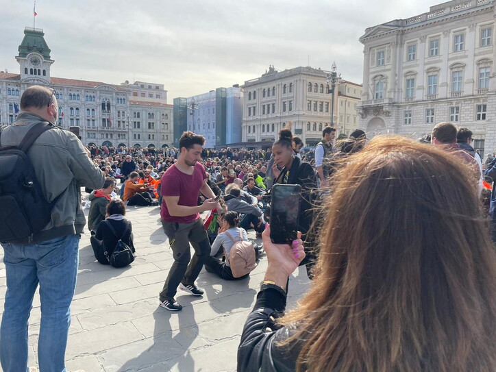 Al presidio è presente anche il portavoce dimissionario dei portuali triestini Stefano Puzzer, ben raccontato da Adriano Sofri sulle pagine del Foglio.