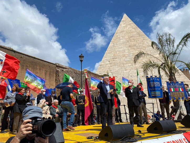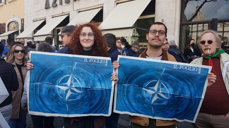 Come detto, a Largo Argentina, in centro a Roma, è stata indetta una manifestazione in ricordo della Liberazione e che però ha una stretta correlazione con la guerra in Ucraina. Organizzata da Azione/Più Europa, ha visto i partecipanti intonare l'inno ucraino, sventole bandiere di Kyiv ed esprimere vicinanza ai valori della Nato: alcuni partecipanti avevano con sé le bandiere dell'Alleanza atlantica realizzate dal Foglio. (Simone Canettieri)