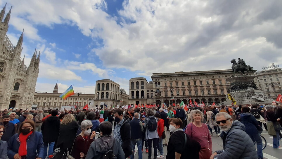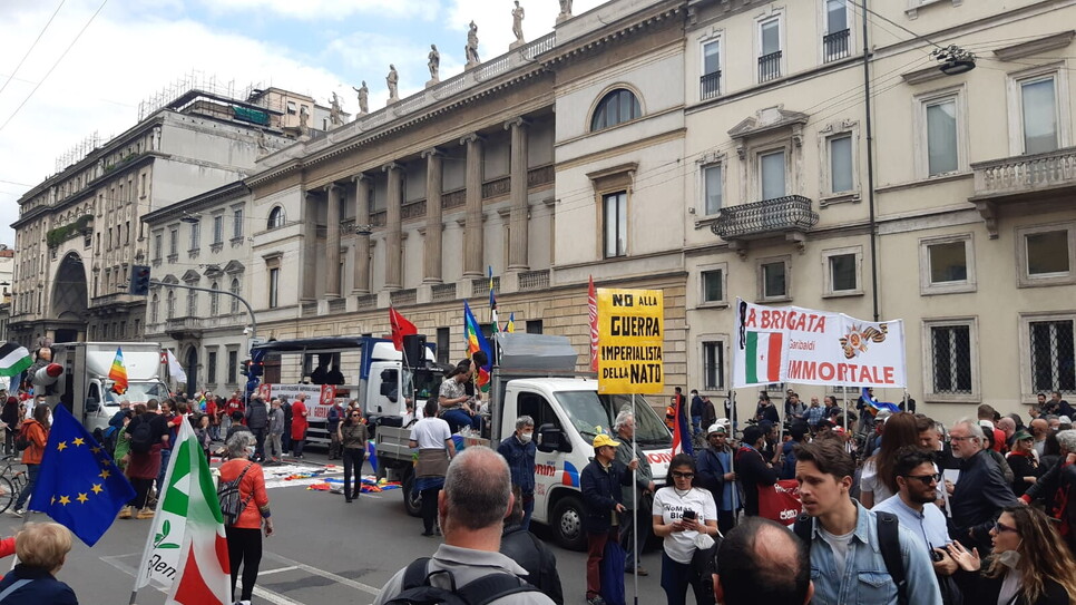 Piazza Duomo, ore 17. Quadrilatero della resistenza: sindacati, Anpi ed ex deportati, comunità ucraina e gruppi di estrema sinistra. Questi ultimi, arroccati sulla statua equestre di Vittorio Emanuele II, sono l'unico residuo del mosaico antiatlantista che nelle prime fasi del corteo mostrava sfaccettature ai limiti della schizofrenia - filosovietici, no vax, fronte palestinese tutti insieme appassionatamente (vedi aggiornamenti precedenti).