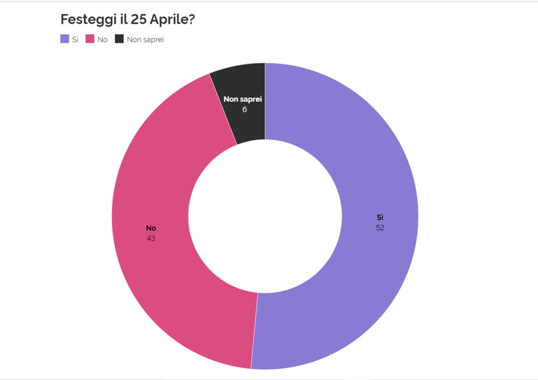 Nonostante una buona parte della popolazione non lo festeggi, l’82 per cento ritiene importante il 25 aprile per la memoria storica, e il 69 per cento riconosce che la Resistenza è sempre attuale perché ci sono sempre minacce in agguato contro la libertà e la democrazia.