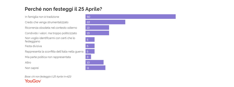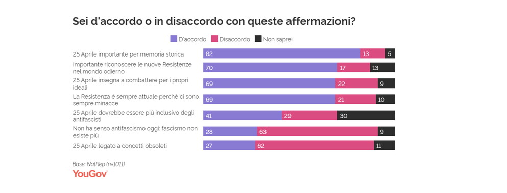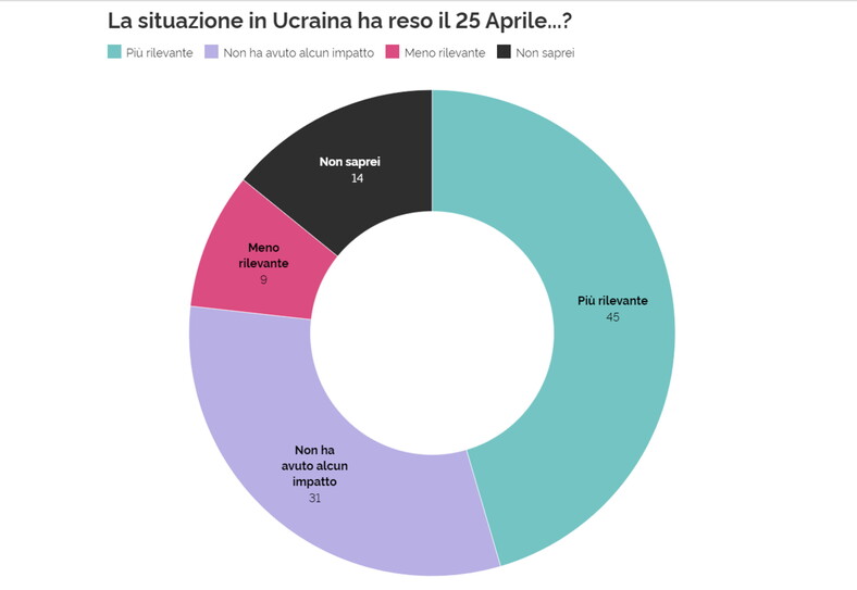 YouGov fotografa il sentimento conflittuale dei cittadini riguardo alla celebrazione del 25 aprile. Il 45 per cento lo ritiene più rilevante a causa della guerra nell'est Europa e la metà ritiene la resistenza di Kyiv comparabile a quella dei partigiani. Un sondaggio