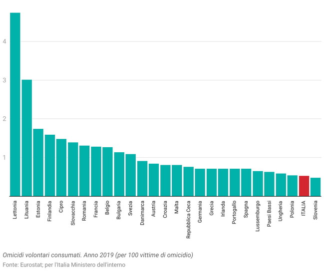 Allargando lo sguardo, si può notare come - dopo la Slovenia - siamo il paese europeo con meno omicidi: 0,53 per 100 mila abitanti. Inoltre, secondo l'Indice della pace globale 2022 sviluppato dall'Institute for Economics and Peace (che analizza 23 indicatori), l'Italia si colloca al 32esimo posto (su 163) nel mondo per sicurezza.