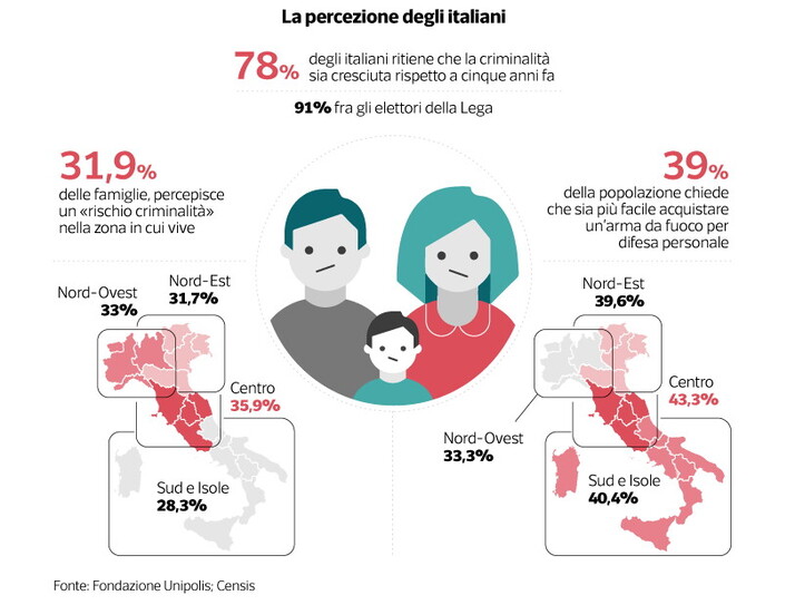 Nel 2017, il 78 per cento degli italiani rieteneva che la criminalità in Italia fosse cresciuta rispetto ai cinque anni precedenti.