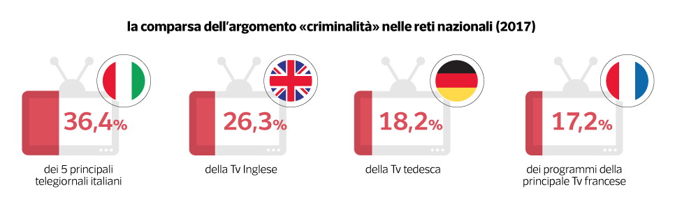 Insomma, stando ai fatti e non alle opinioni, siamo il (grande) paese più sicuro d'Europa e tra i meno pericolosi del mondo. Eppure la percezione di insicurezza cresce così come la paura, favorita da politica e media: nel 2017 il tema "criminalità" è comparso nel 36,4 per cento dei 5 principali telegiornali italiani (mentre solo nel 17,2 per cento dei programmi della principale Tv francese e nel 18,2 per cento di quella tedesca).