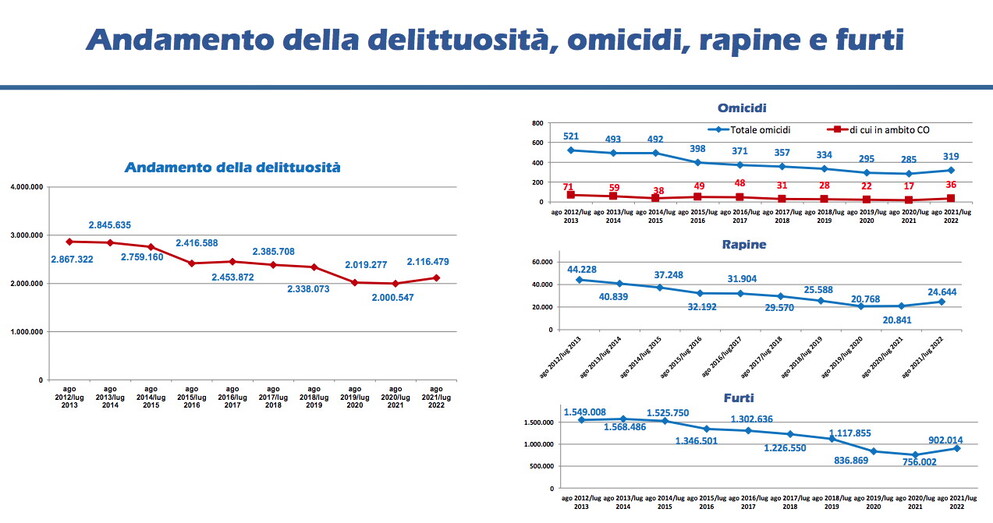 Nel 1991, ad esempio, sono avvenuti 1918 omicidi. Nel 2008 erano 611, nel 2012 già cento in meno e oggi sono 319. Prendendo in esame le rapine: in 10 anni sono diminute quasi del 50 per cento (da 44.228 a 24.644). Nello stesso periodo i furti sono stati un terzo in meno (da 1.549.008 a 902.014). L'andamento generale della delittuosità ha visto quindi una diminuzione di 800.000 reati: nel 2012 erano 2.867.322 e oggi sono 2.116.479.