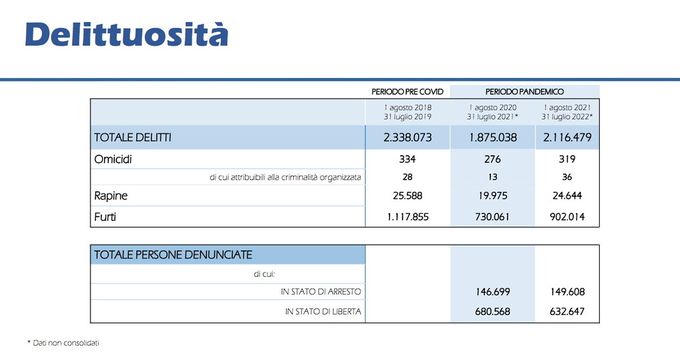 Dal 1 agosto 2021 al 31 luglio 2022, in Italia sono stati commessi 2.116.479 reati. Gli omicidi sono stati 319 (di cui 36 attribuibili alla criminalità organizzata), mentre sono state effettuate 24.644 rapine. 902.014 sono invece i furti compiuti. Si tratta di numeri in aumento rispetto al periodo precedente, che però era stato il migliore dell'ultimo decennio, per una semplice ragione: lockdown, limitazioni e divieti per far fronte all’emergenza sanitaria hanno inciso sulle variazioni percentuali. Contestualizzando, si comprende come nel nostro paese non ci sia nessuna emergenza sicurezza. I delitti in Italia, infatti, risultano in graduale ma costante calo dall'inizio di questo secolo ormai.