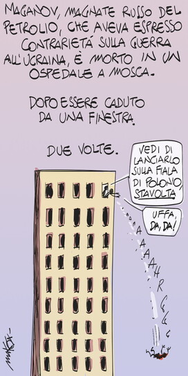 L’ambasciata russa in Italia ha pubblicato su Facebook un commento alla vignetta di Makkox pubblicata sul Foglio di oggi – un palazzone con due uomini alla finestra e un altro che cade e la scritta: “Maganov, magnate russo del petrolio, che aveva espresso contrarietà sulla guerra all’Ucraina, è morto in un ospedale a Mosca. Dopo essere caduto da una finestra. Due volte”. Gli uomini affacciati, nel disegno, dicono: “Vedi di lanciarlo sulla fiala di polonio, stavolta”. “Uffa, da, da!”. L’ambasciata russa scrive che “si sente spesso dire: ‘La Russia è parte dell’Europa’, ‘abbiamo la stessa cultura’. Tuttavia il quotidiano Il Foglio del 2 settembre ci fa dubitarne seriamente. La cultura russa assume un atteggiamento rispettoso nei confronti della morte. Di qualsiasi persona, in qualsiasi circostanza. Lo stesso si può dire della cultura del Tatarstan, basata sulle tradizioni dell’islam, cui apparteneva il presidente del cda della compagnia petrolifera Lukoil, Ravil Maganov, tragicamente morto a Mosca. Tuttavia Il Foglio ha considerato la sua morte un’occasione buona per una vignetta derisoria. Non insistiamo che la redazione del Foglio chieda scusa ai parenti e agli amici di Ravil Maganov. A quanto pare, in questo giornale si sono semplicemente radunate persone di cultura diversa”.