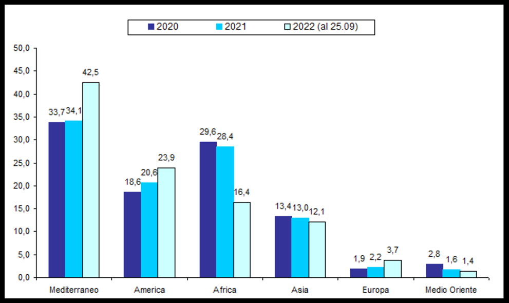Dal primo gennaio al 25 settembre 2022, i migranti che hanno perso la vita o dispersi mentre attraversavano il Mediterraneo centrale sono stati 1.088. È una tendenza in crescita rispetto agli ultimi anni: la percentuale dei morti e dei dispersi quest'anno si attesta al 42 per cento, rispetto al 34 per cento dell'anno scorso, stando ai dati della fondazione Ismu (Iniziative e studi sulla multietnicità). Nel 2015, uno degli anni con maggiori flussi verso le coste italiane, erano morti quasi 3.800 migranti. L'anno dopo, secondo l'Oim (Organizzazione internazionale per le migrazioni), le morti sono state più di 5.000. Poi dal 2017 il trend è stato in diminuzione. Nel 2020, anno della pandemia, i migranti che si sono imbarcati sulle coste del Nordafrica sono stati molto pochi e si è raggiunto il livello più basso delle partenze. Ma già dal 2021 il numero dei morti è raddoppiato di nuovo (3.077). In tutto, dal 2014 a oggi, sono quasi 25 mila i morti e i dispersi nelle acque del mar Mediterraneo. Inoltre, se è vero che si possono mettere a confronto questi numeri, d'altra parte non si avrà mai la certezza sul numero delle persone partite. Con la fine della missione Mare Nostrum, la sorveglianza delle rotte del Mediterraneo centrale si è fortemente ridimensionata e molti dei dati sulle partenze dei barconi dalle coste libiche sono comunicati dalle ong e dalle autorità libiche.