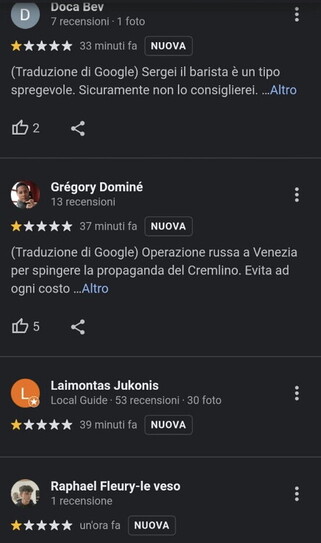 “Pure Serghei non mi aveva mai creato problemi”. E il suo amico? “L’ho visto qualche volta, non è un cliente abituale. E soprattutto non parla italiano: come potrebbe fare proseliti? Perché la polemica salta fuori soltanto ora? Mi domando se quelli pagati per dire certe cose alla fine non siano gli altri”. Chi sono gli altri? Scopriamo che il signor Knoks lavora al municipio di Riga ed è un ex consigliere del ministero della Difesa della Lettonia. Dopo il tweet è volato a Cuba, in vacanza. Riusciamo a contattarlo dopo alcuni giorni. Ribadisce che “i due tizi riempivano il bar con le fake news del Cremlino, ma è possibile che si tratti di uscite spontanee e che la proprietaria fosse ignara di tutto: chi supporta Putin, comunque, o prende soldi o è senza cuore”. La sua parola contro la loro. Qualche elemento per andare oltre? “No. È così. Ci ho pensato a lungo prima di pubblicare questa storia, ma non potevo trascurare le vittime ucraine”. Nel dubbio, ci va di mezzo un’attività commerciale. Anche se il Bar barbari sta tornando alla normalità e Google cancella le recensioni pretestuose: il rating è risalito a 4,8. Tutto come se niente fosse. E forse niente è successo.