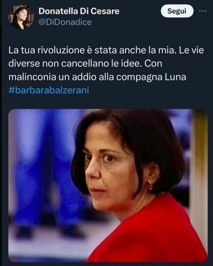 "La tua rivoluzione è stata anche la mia. Le vie diverse non cancellano le idee. Con malinconia un addio alla compagna Luna". Il post di Donatella Di Cesare dedicato all'ex brigatista Barbara Balzerani, morta ieri a Roma, è stato online quanto basta per essere notato. Dopo averlo pubblicato, questa mattina su X, la professoressa di Filosofia della Sapienza ha infatti deciso di cancellarlo. Troppo tardi per evitare la polemica. Che d'altra parte la prof. dice di non comprendere. "Sono stupita per questa bufera che si è sollevata. Ho reagito alla morte Di Barbara Balzerani con un post molto breve ricordando il titolo Di un suo libro", ha commentato interpellata da LaPresse. "Appartengo a quella generazione, ma non ho mai condiviso in nessun modo i metodi violenti".