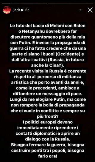 "Le foto del bacio di Meloni con Biden o Netanyahu dovrebbero far discutere quantomeno più della mia con Putin. E invece la propaganda di guerra ci ha fatto credere che da una parte ci siano i buoni (Occidente) e dall'altra i cattivi (Russia, in futuro anche la Cina?)". Sono parole scritte su una storia Instagram dallo street artist Jorit, nome d'arte di Ciro Cerullo, per rispondere alle polemiche sollevate dal suo abbraccio con Putin. Due giorni fa, al Forum internazionale della gioventù a Mosca, Jorit ha chiesto una foto al presidente russo, dicendo: "Voglio mostrare all’Italia che sei un essere umano".