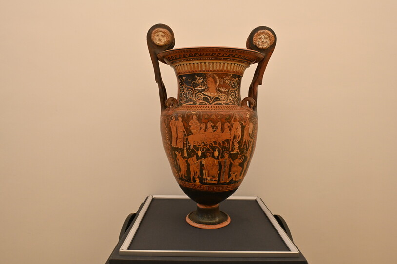 Sul portone due agenti in divisa, schiacciati nella bussola perché diluvia e l’acqua rimbalza sul selciato di via Giulia. Il metal detector, “passi di qua”. Il primo che ti si fa incontro, riemerso da un’infinità di tempo direbbe il poeta, è un grande cratere con le figure rosse, scene di mitologia e vita quotidiana, di produzione attica, un vaso conviviale del quinto o sesto secolo avanti Cristo. La sua teca trasparente, che ha ancora qualcosa di provvisorio, apre una sfilata di reperti fratelli: crateri a colonnette o a calice o a campana, vasi funerari, prodotti nella Magna Grecia. Nel corridoio di un palazzo ben dotato di storia, l’effetto è quello di un museo ai suoi primi passi ma già opulento. Eppure gli uomini in divisa e i funzionari che vi si muovono non sono turisti.