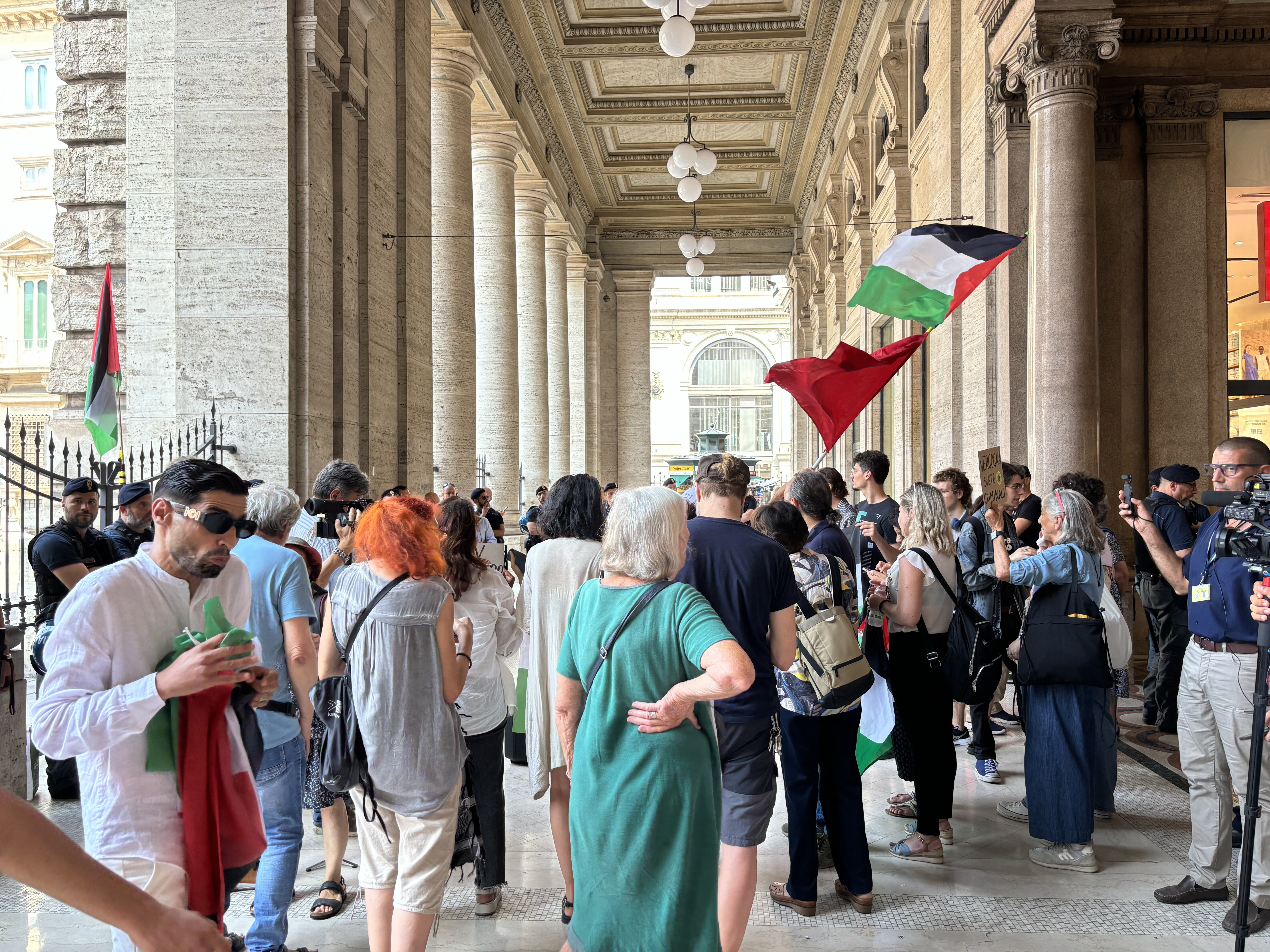 Qui i manifestanti hanno sventolato qualche bandiera palestinese e inneggiato a cori contro lo stato di Israele e suonato la canzone di Ghali presentata allo scorso Festival di Sanremo "Casa Mia". "Loro parlano sempre e solo di 7 ottobre, noi parliamo di 75 anni di invasione", gridava un uomo al microfono durante la protesta. "Israele Vaffanculo", "Palestina Libera", e "Intifada, fino alla vittoria" sono solo alcune delle frasi che i manifestanti hanno urlato davanti a un lungo cordone di poliziotti.