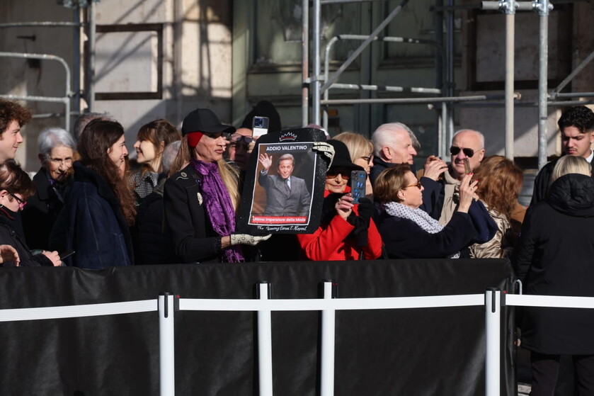 Il feretro di Valentino Garavani è entrato in chiesa accompagnato dalle note della Lacrimosa di Mozart, mentre è uscito su quelle del Nostro concerto di Umberto Bindi. Alla Basilica di Santa Maria degli Angeli e dei Martiri in piazza della Repubblica sono arrivate centinaia di persone. In mezzo a ospiti illustri e fan del grande stilista, morto lunedì a Roma a 93 anni. Il servizio d'ordine è imponente, con quasi 100 persone all'interno e all'esterno della basilica. Davanti alla basilica, tra le transenne, un cartello scritto a mano recita: "Tutto il mondo piange Valentino. Perdiamo il fiore più bello". È il messaggio che accoglie chi arriva sulla piazza, insieme ad un flusso continuo di persone, qualcuno con un mazzo di fiori, altri con in mano una sua foto. L'organizzazione del funerale è stata studiata fin nel minimo dettaglio, come avrebbe voluto il patron della maison. Quasi come fosse la sua ultima sfilata. Lo si capiva già dalla camera ardente allestita negli scorsi giorni nella sede della fondazione di piazza Mignanelli: un trionfo del bianco ovunque. E l'allestimento della chiesa che ospita i funerali di Valentino conferma lo stile scelto dallo stilista: tutta in bianco, con fiori e corone composti soprattutto di rose, tra i suoi fiori preferiti. Tra i fedeli, in tanti hanno scelto di indossare però un copricapo rosso, in omaggio al colore simbolo del grande maestro della moda italiana e mondiale.