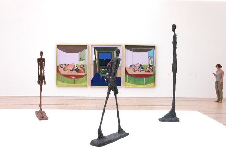 I primi due sono quelli più immediati: l’incontro con Isabelle Rawsthorne. E poi, appunto, il tema della gabbia, che Bacon prende tout-court da Giacometti. C’è la stanza dedicata all’ossessione per il ritratto (difficile tener conto del numero delle teste di Giacometti, da quelle alte pochi centimetri, fino alle monumentali). C’è poi sala che invita a riflettere sul rapporto tra tempo e spazio, la più impressionate: vedremo ancora tanti e tali capolavori accostati con una simile eleganza e intelligenza? Di Giacometti c’è L’Homme qui marche II del 1960, nella versione in gesso e in quella in bronzo. Poi due monumentali Grande femme dello stesso anno. Cinque Femme de Venice, due in gesso e tre in bronzo. E di Bacon: cinque opere singole, tra cui uno sconvolgente Study for a bullfight n.2 del 1969 e tre trittici da capogiro. In particolare, quello in memoria di George Dyer, dipinto dopo il suicidio, di proprietà della Beyeler, qui, a confronto diretto con gli altri, si mostra in tutta la sua struggente forza. Sono accostamenti tematici che, pur restando alla superficie dell’opera di entrambi, danno la possibilità, anche per la maestosità, il numero, le dimensioni e la qualità dei pezzi esposti, di verificare la profonda comunanza di intenti.