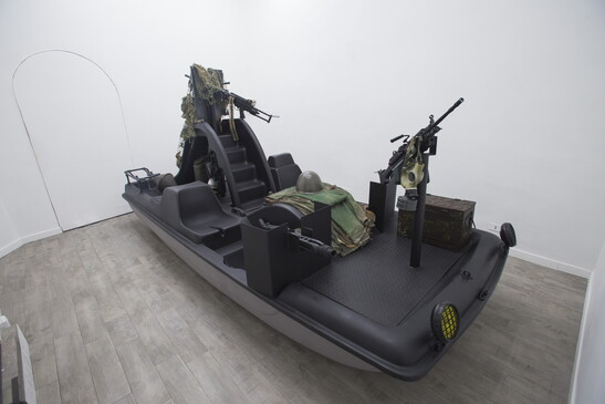 “Bisogna affondarli!“, “Lasciateli in acqua” e “Buon appetito ai pesci”. Mentre vengono chiusi i porti, qualcuno si sente autorizzato a esprimere questi auguri sprezzanti ai migranti. “E allora fatelo davvero: eccovi lo strumento adatto”, dice al Foglio Cristiano Carotti, davanti al pezzo forte della sua ultima mostra, Stessa spiaggia, stesso mare, inaugurata il 17 novembre alla White Noise Gallery di Roma: Seagull SS17-prototipo per strumento di autodifesa popolare è l’opera forse più emblematica della mostra. Una rivisitazione provocatoria di un pattino che, nelle mani del giovane artista ternano, passa da icona delle spensierate vacanze italiane a mezzo militare, equipaggiato di mitraglia e in livrea mimetica. “L’idea è nata da una pulsione semplice. La mia attenzione è stata catturata dal tema della caccia al migrante, spinta l’estate scorsa in maniera violenta, e da quei commenti mostruosi sulle sorti da riservare ai naufraghi”, spiega Carotti. “Mi ha colpito, più della manipolazione propagandistica di chi ha fatto della paura dello straniero uno strumento demagogico, la recettività del ‘pubblico’, di chi recepisce e muta questa dinamica, di chi esprime senza problemi la propria xenofobia”.