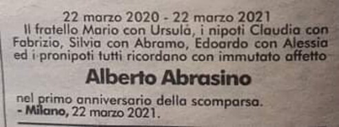 I refusi, a volte, aprono baratri e spalancano orizzonti. Lunedì, per esempio, sulle pagine dei necrologi del Corriere della Sera è apparsa questa melanconica perla: “22 marzo 2020 – 22 marzo 2021. Il fratello Mario con Ursulà, i nipoti Claudia con Fabrizio, Silvia con Abramo, Edoardo con Alessia ed i pronipoti tutti ricordano con immutato affetto Alberto Abrasino nel primo anniversario della scomparsa”.