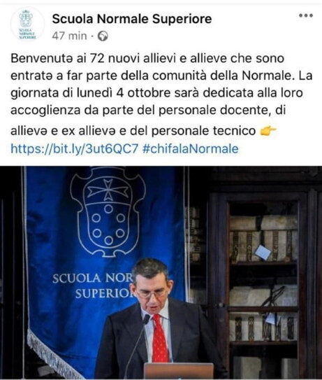E dunque, ecco che la Normale decide di adeguarsi, o di cedere, allo spirito del tempo. "Benvenutə ai nuovi 72 allievi e allieve (e perché, ci chiediamo noi, quell'"ai" non viene allora pure esso tacciato di patriarcato, e mondato con asterischi purificatori) che sono entratə a far parte della Normale. La giornata di lunedì 4 ottobre sarà dedicata alla loro accoglienza da parte del personale docente, di allievə ed ex allievə e del personale tecnico (e perché, obiettiamo ancora, questa incoerenza tra il primo rigo, con "allievi e allieve", e l'ultimo, dove invece si ricorre alla formula no-gender?)".