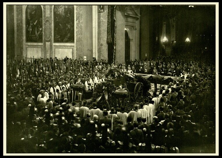 Maria Bergamas la si può vedere ancora oggi avanzare lentamente, mater dolorosa vestita tutta di nero, davanti alle bare allineate ai lati dell’altare maggiore della basilica di Aquileia. Gloria. Apoteosi del soldato ignoto è il contributo del cinema alla creazione del mito del Milite ignoto, perché la traslazione con il viaggio del feretro per l’Italia e la grande cerimonia a Roma riprese dalla Federazione cinematografica italiana e dall’Unione fototecnici cinematografici furono anche il più grande evento mediatico a cui l’Italia avesse mai partecipato. Il film, restaurato in occasione del centenario dalla Cineteca del Friuli, ha una piccola falla proprio nel momento del “riconoscimento” della bara da parte di Maria Bergamas: la vediamo avvicinarsi alla decima cassa, accompagnati da una didascalia a schermo intero – “Nel trepido palpitare dei cuori… la madre mormorò: eccolo” – e poi è subito inginocchiata e commossa con le mani appoggiate alla bara. Ci racconta qualcosa di più (anche l’enfasi di un secolo fa) il diario di un testimone: “… Trattenendo il respiro giunse di fronte alla penultima bara davanti alla quale, oscillando sul corpo che più non la reggeva e lanciando un acuto grido che si ripercosse nel tempio, chiamando il figliolo, si piegò, cadde prostrata e ansimante in ginocchio abbracciando quel feretro”.