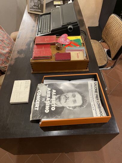 In mostra, anche una piccola “menzione” del Campiello, perché Arba non vinse mai né quello né tantomeno lo Strega, e insomma si capisce che non cambia mai niente. E uno dei piccoli nipoti che ha preso un giorno di permesso a scuola, emozionato ha detto alla maestra che andava a presenziare la cerimonia per lo zio Arbasino. E la maestra? “Arbasino chiii?”. Ma tornando a casa commossi e stupiti (Arba è riuscito a non sbagliare neanche questa volta, neanche da morto) ripassando dai giochi di luce di Eliasson a palazzo Strozzi, forse al Vieusseux manca un sonoro per un Arbasino “totale” con altoparlanti: potrebbero diffondere le ballate scritte per Laura Betti o meglio ancora i messaggi della segreteria telefonica al fisso di Roma, che recitava via via messaggi surreali cambiati spessissimo per scoraggiare gli intrusi (“Il dottore è in agitazione. Per richieste di lavoro lasciate proposte in dollari, lire, ecu, o mandate un fax). I più intimi sapevano, e attendevano. Talvolta il messaggio era cantato. Se qualcuno conserva registrazioni, o carta termica, parli immediatamente.