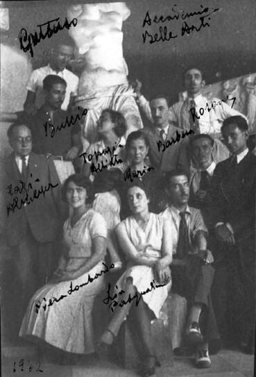 Appena usciti dall’adolescenza entrambi. Leggiamo il graffito. Nella prima parte è riconoscibilissima la scrittura di Guttuso: la firma “Renato Guttuso” e immediatamente sotto la data “5-1-1929”. Seguono parole poco chiare dove è sicuramente leggibile la lettera l seguita da una A maiuscola. Si potrebbe leggere in questo modo: “l’Amore mio”. È una lettura arrischiata ma non incompatibile con le tracce di scrittura che si vedono e coerente col contesto. Me ne assumo la responsabilità. La scritta che segue proviene dalla mano di Topazia: si legge una T particolarmente elaborata, che è l’iniziale di Topazia, sottolineata da una linea orizzontale ben marcata. Immediatamente sotto, la stessa mano riscrive la data “1929” pure essa sottolineata da una linea orizzontale altrettanto marcata. Il graffito è una dichiarazione d’amore firmata dai giovanissimi innamorati: inizia Renato, conferma e sottoscrive Topazia. Topazia è a casa sua e per lei sarà stato anche un atto di ribellione verso la famiglia che non doveva vedere di buon occhio quella amicizia. La storia d’amore dell’aristocratica Topazia e del piccolo borghese Renato meriterebbe studi approfonditi per i suoi numerosi risvolti culturali e storici. Sappiamo meno di quanto ne vorremmo sapere.