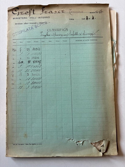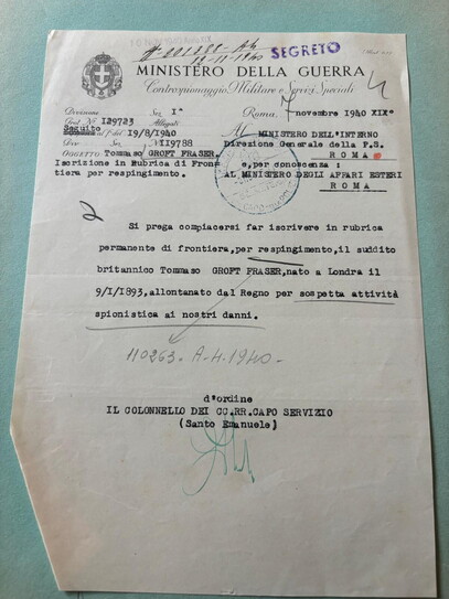 Vicenda chiusa, ma non del tutto. Il Controspionaggio, informato dell’esito, risponde il 7 novembre alla Direzione generale pubblica sicurezza e per conoscenza al ministero degli Affari esteri: “Si prega compiacersi far iscrivere in rubrica permanente di frontiera, per respingimento, il suddito britannico Thomas Croft-Fraser, allontanato dal Regno per sospetta attività spionistica ai nostri danni”. Al ministero della Guerra vogliono essere sicuri che non torni più, sicché il giorno 13 tale disposizione è girata alla Divisione polizia di frontiera e trasporti.