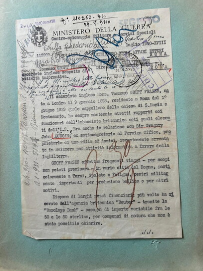 Cosa lesse Senise quel mattino? Che il sacerdote, residente a Roma ormai da undici anni, “ha sempre mantenuto stretti rapporti coi funzionari dell’Ambasciata britannica noti quali elementi dell’I.S.” (l’Intelligence Service); che “era anche in relazione con Sir Gregory John Duncan, ex sottosegretario al Foreign Office, proprietario di una villa ad Assisi, recentemente arrestato in Svizzera per attività informativa a favore della Inghilterra”; che “effettua frequenti viaggi – per scopi non potuti precisare – in varie città del Regno, particolarmente a Terni, Spoleto e Foligno, centri militarmente importanti per produzione bellica o per altri motivi”. Nel rapportino, frutto di pedinamenti e investigazioni, si aggiungeva che il monsignore “dispone di larghi mezzi finanziari: più volte ha ricevuto dall’agenzia britannica ‘Reuter’ – tramite la Barclays Bank – assegni di importo variabile fra le 50 e le 60 sterline, per compensi di natura che non è stato possibile chiarire”. “Risulta che dopo l’arresto di Duncan in Svizzera fu confidenzialmente avvertito dall’Ambasciata britannica di sospendere ogni attività, ciò che dette più sicura consistenza ai sospetti già esistenti nei suoi riguardi”. Il colonnello Emanuele non dubita: Croft-Fraser è una spia che si serve dello status ecclesiastico per andarsene in giro a curiosare ed è perciò “da tempo oggetto di vigilanza da parte degli organi di controspionaggio, vigilanza che è stata intensificata in questi ultimi tempi in dipendenza dello stato di guerra”. L’inglese è dipinto come “uomo scaltro”, che “per sottrarsi a controlli nei suoi contatti esteriori, si appoggia molto a case ed istituti religiosi, per cui non è facile seguirlo e colpirlo”. Il colonnello se ne rammarica: “Pur mancando la prova giuridica per denunziarlo al Tribunale speciale quale agente informatore del servizio inglese, vi sono fondati elementi di sospetto che autorizzano a considerarlo con coscienza tranquilla persona pericolosa, specie nell’attuale momento. Si rappresenta il caso per l’azione che codesto ministero riterrà opportuna al fine di promuovere l’allontanamento dal Regno dell’indesiderabile sacerdote”.
